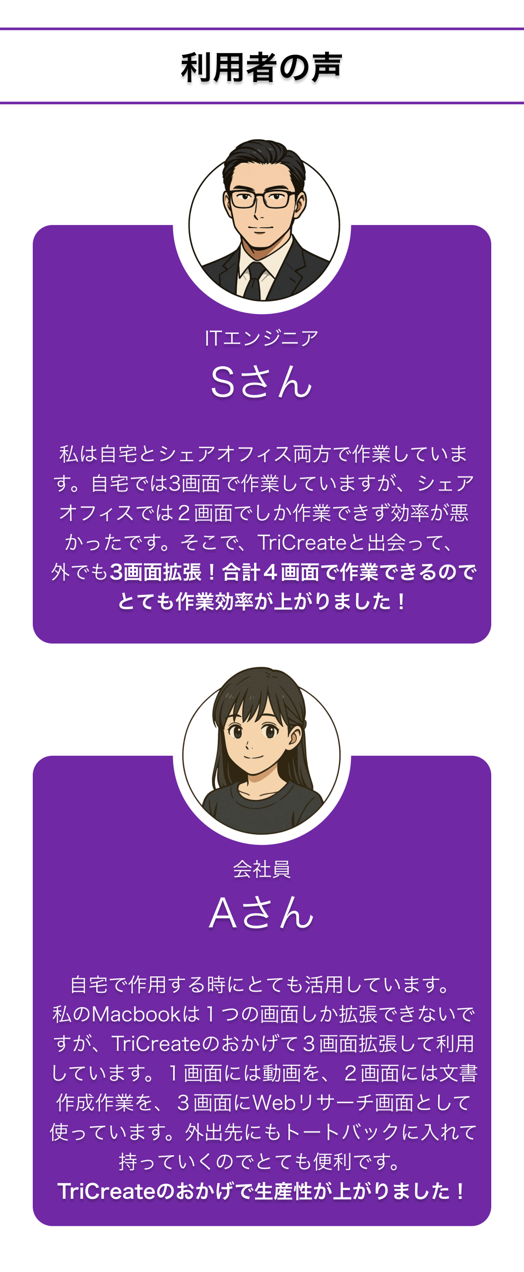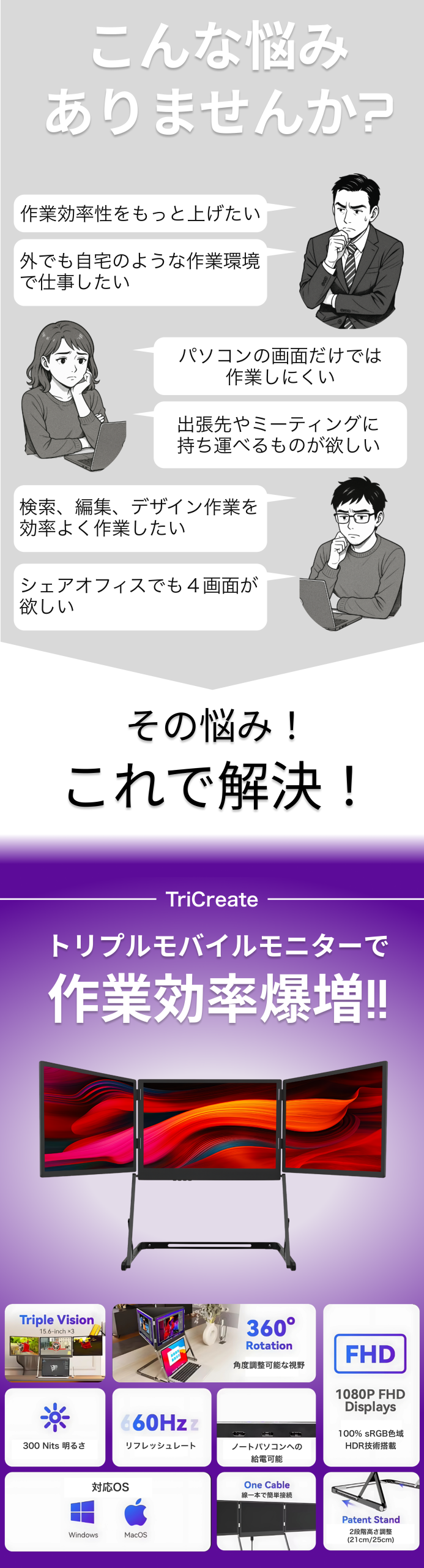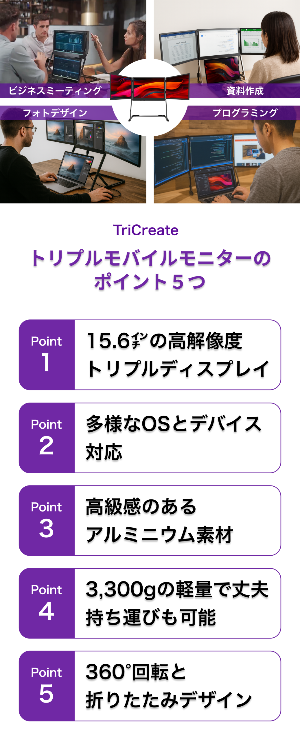 在宅ワーカーや出張が多いビジネスパーソン、クリエイター、ゲーマー、そして複数の作業を同時にこなすあらゆる人々に向けて、TriCreateは新たな価値をもたらす革新的なソリューションです。