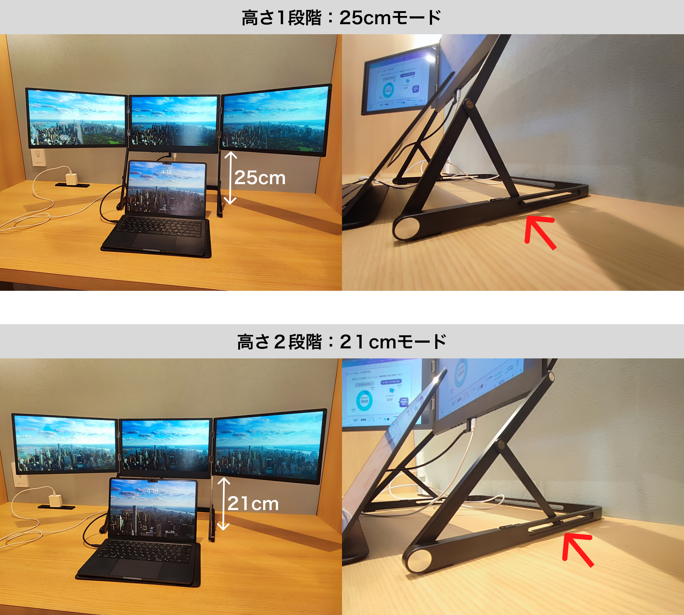 特許を取得した独自の高さ調整スタンドで2段階の高さが調整でき、