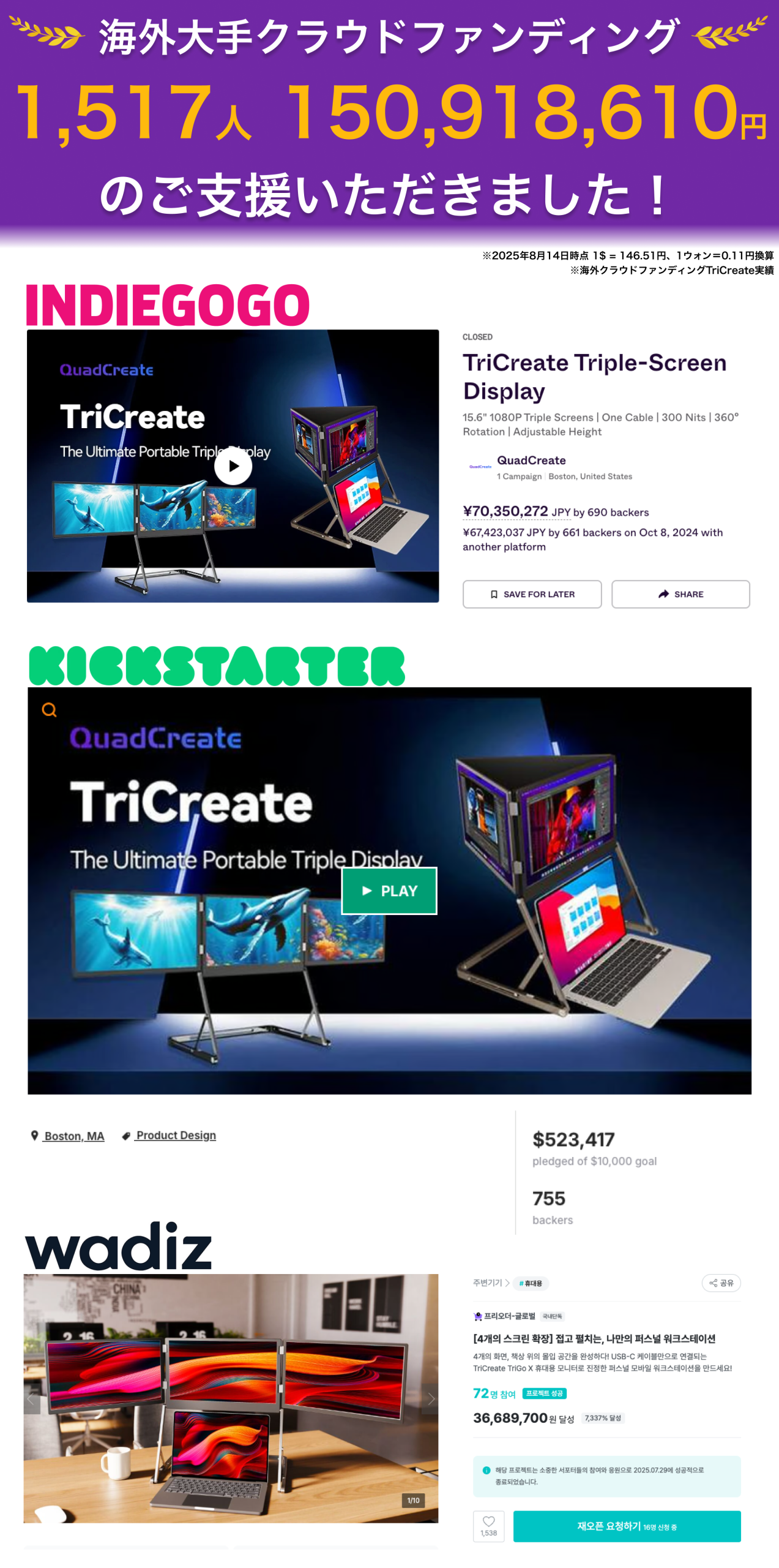 今回提案する商品は、独自のスタンド設計で持ち運べるトリプルモバイルモニターになります。 ぜひ世界で広まっているこの 「TriCreate」 を、日本でも広めたいと思いプロジェクトの立案に至りました。